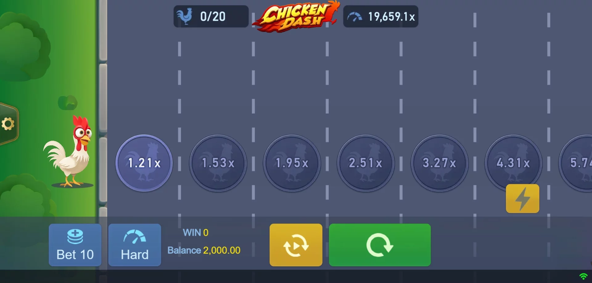 En Chicken Dash, cada avance del ave incrementa la recompensa posible, pero también la amenaza de ser embestida. Determinar el instante preciso para detenerse y asegurar las ganancias constituye la decisión estratégica principal. Al inicio de cada partida, se establece una apuesta inicial y después se define el grado de peligro al dirigir al animal. ➡️ Mientras más distancia atraviese el pollo, más alta será la gratificación. 🚧 Sufrir un impacto reinicia los avances de esa fase